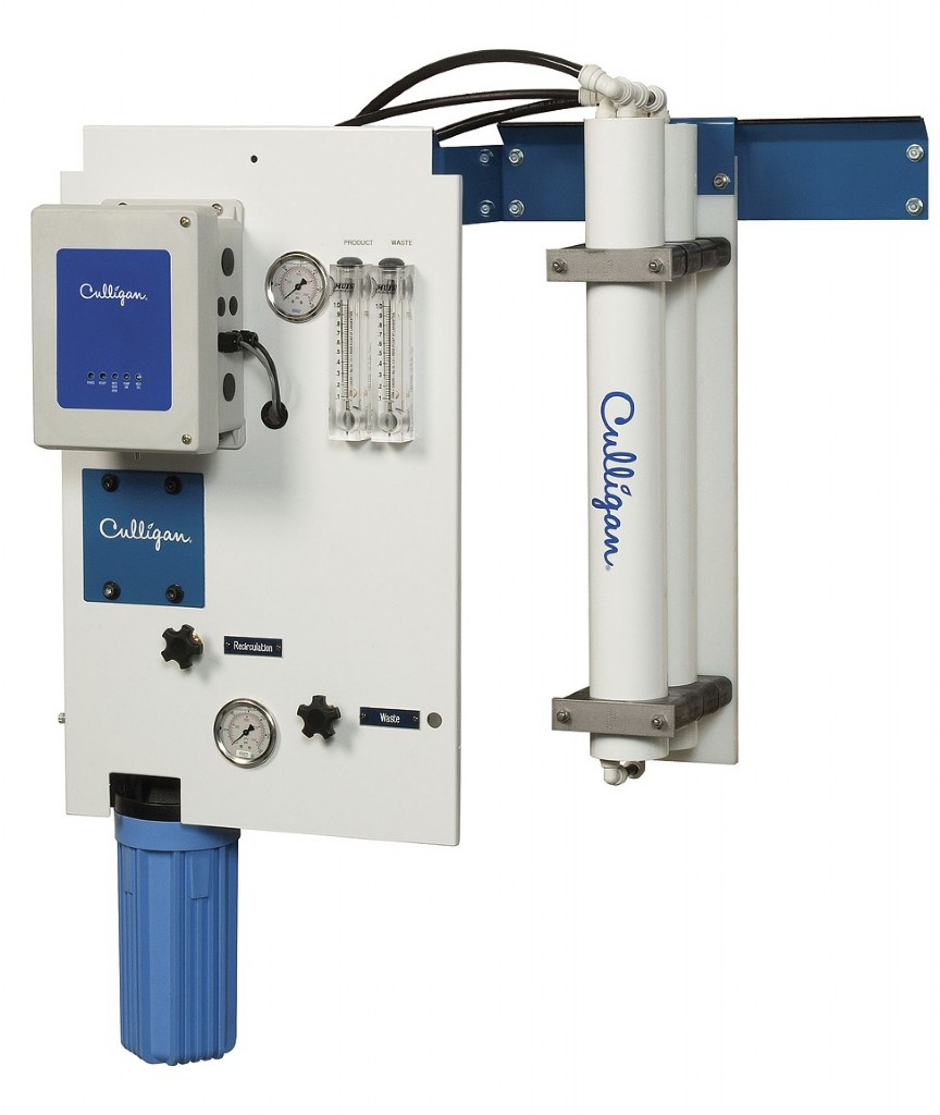 Wandmontage, rotierende Flügelpumpe, Einlassmagnetventil, Vorfiltereinsatz zu M1-2S, Ablauf und Rezirkulationsventil, Druckanzeige, FRP Membrangehäuse, elektrischer Durchflussmesser, Culligan-Steuereinheit